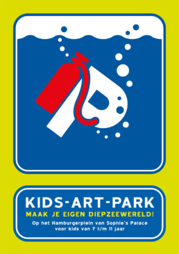 Affiche voor een creatieve week, waarbij kinderen op het parkeerterrein van het Hamburgerplein samen een onderwaterwereld bouwen.